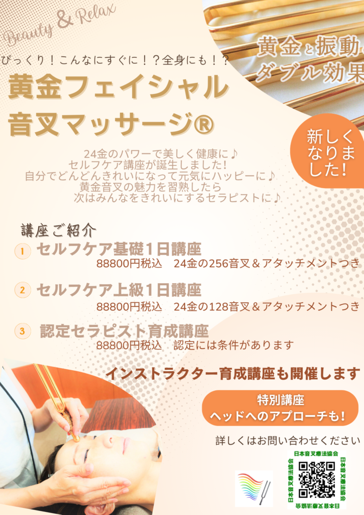 ・内容:128音叉を使った顔のこりほぐし、深部へのケアなどのセルフケアを学びます。